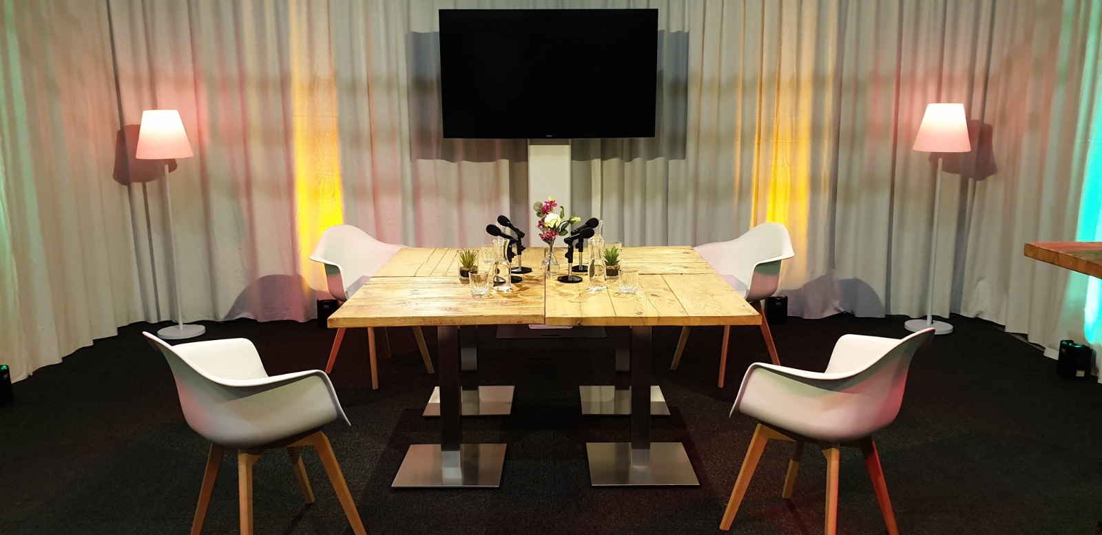 De inrichting van de studio is stoer, luxe en sfeervol. De basis is een talkshow-achtige setting met een grote tafel waaraan de gasten kunnen plaatsnemen. Een andere mogelijkheid zijn luxe fauteuils waarmee een huiskamer-achtige setting wordt gecreƫerd. Het unieke aan de studio is dat er makkelijk geswitched kan worden van inrichting. Wil je een stoere uitstraling? Kies dan voor een hout met rvs meubellijn met spreektafels, statafels en bijbehorende stoelen. Misschien wil je juist strak en modern? Of toch liever gezellig ingericht? De studio kan ingericht worden op de wensen van de klant. Wil je de bedrijfskleur terug laten komen? Er is van alles mogelijk.